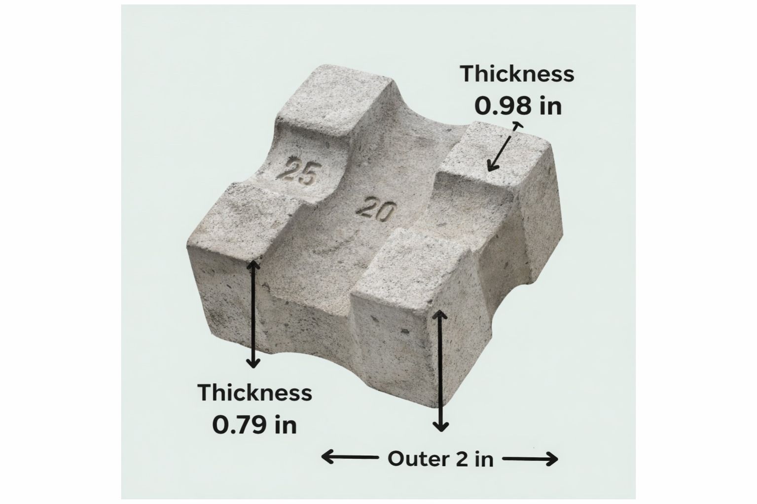 High-quality concrete covering blocks supplied in a box of 100 pieces. Available in 0.79 inches, 0.98 inches, 1.18 inches, and 1.38 inches thickness options. Used to maintain proper concrete cover for reinforcement in construction work.