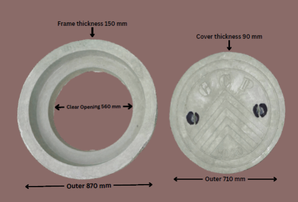 RCC 22 Inch DIA (Outer x Outer) CAPACITY: 20 Tons HEAVY DUTY (HD), MANHOLE COVER (CHAMBER COVER)